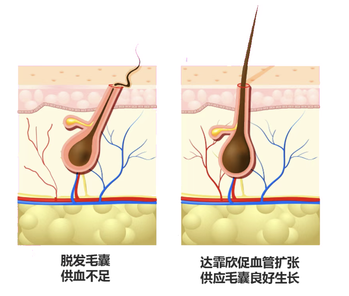 米诺地尔搽剂用于治疗斑秃和雄激素性脱发的作用机理为直接刺激毛囊上皮细胞的增殖和分化 ;促使血管生成,增加局部血液供应 ;开放钾通道,使毛囊由休止期向生长期转化,其在临床上的应用并不具有剂量依赖性 [2]。所以,使用米诺地尔来治疗雄脱,成为了很多人第一选择。