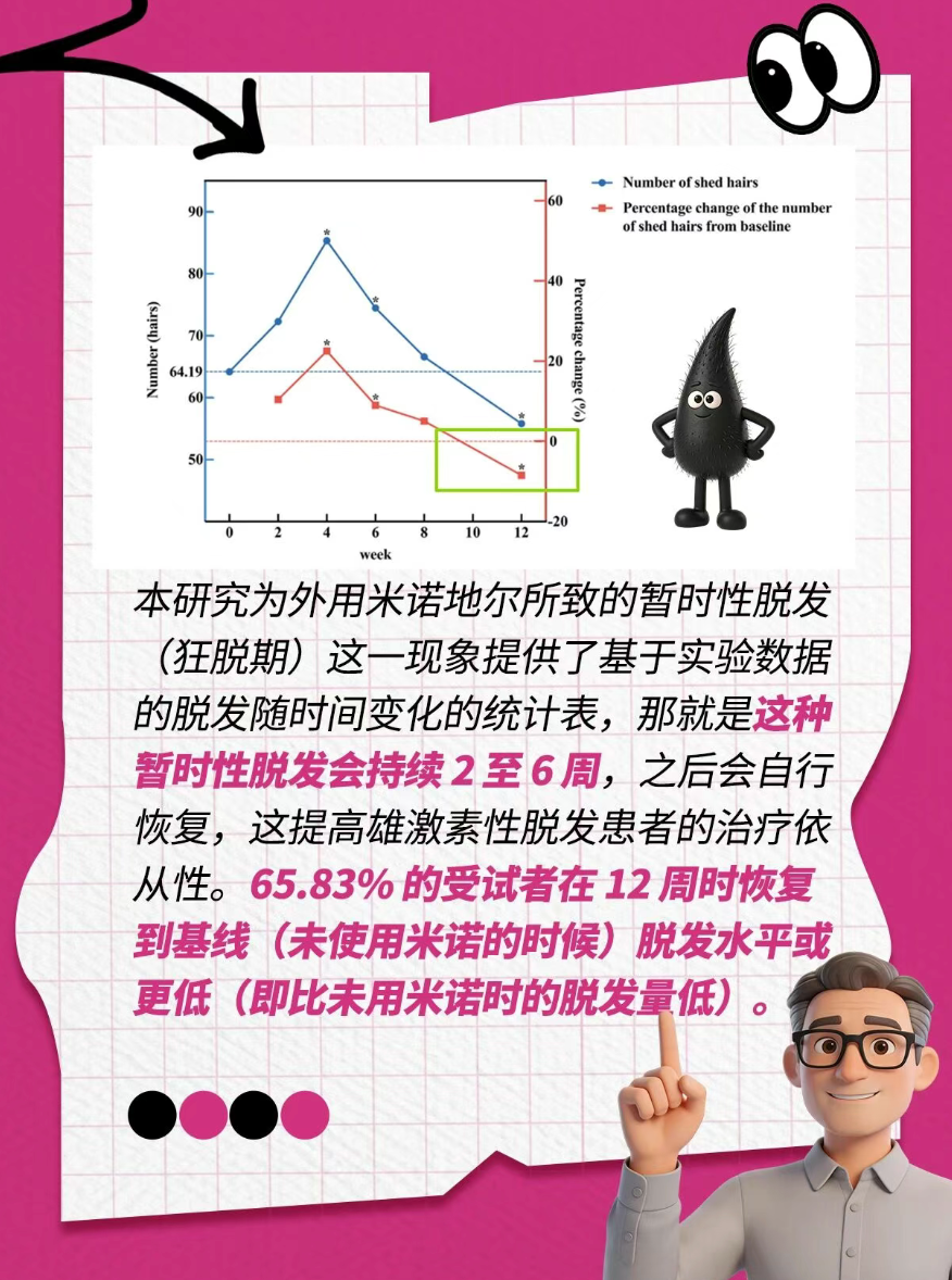 研究表明暂时性脱发会持续 2 6 周,之后会自行恢复,65.83% 的受试者在 12 周时恢复到基线(未使用米诺的时候)脱发水平或更低(即比未用米诺时的脱发量低)